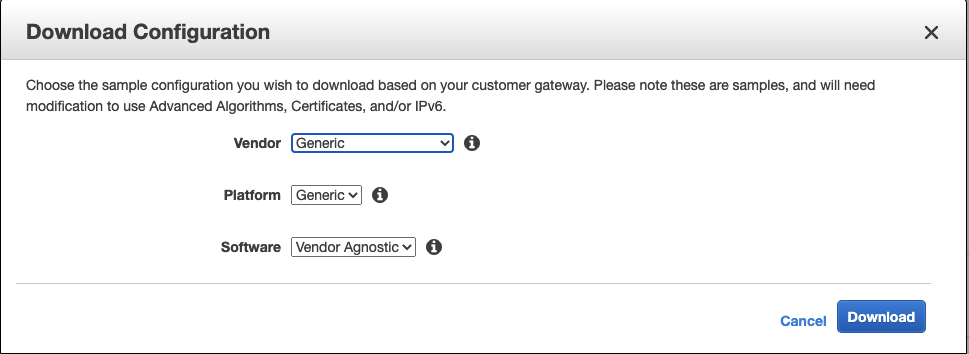 NOTE: If you customized tunnel options when creating or modifying your VPN connection, you may need to modify these sample configurations to match the custom settings for your tunnels.